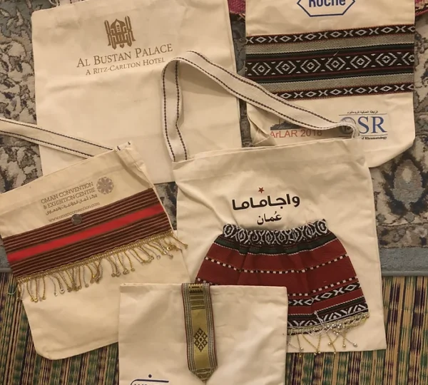 The bags are made in different shapes and sizes from cotton and knitted fabrics that are woven, traditionally or manually. They are natural materials that are not harmful to the environment and wildlife. They also have a traditional implication as they are related to textile materials made from knitted fabric, which is used to make many garments and items that decorate traditional Omani homes.